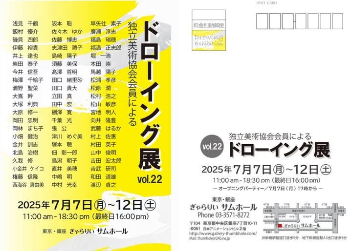 ドローイング展vol22(ぎゃらりぃサムホール/銀座)7月7日(月)~12日(土) 2025年7月7日 by Owner. ドローイング展vol22 独立美術協会員による (ぎゃらりぃサムホール/銀座) 7月7日(月)~12日(土) 岡林まち子さん、直井美穂さん、他 前の記事 次の記事