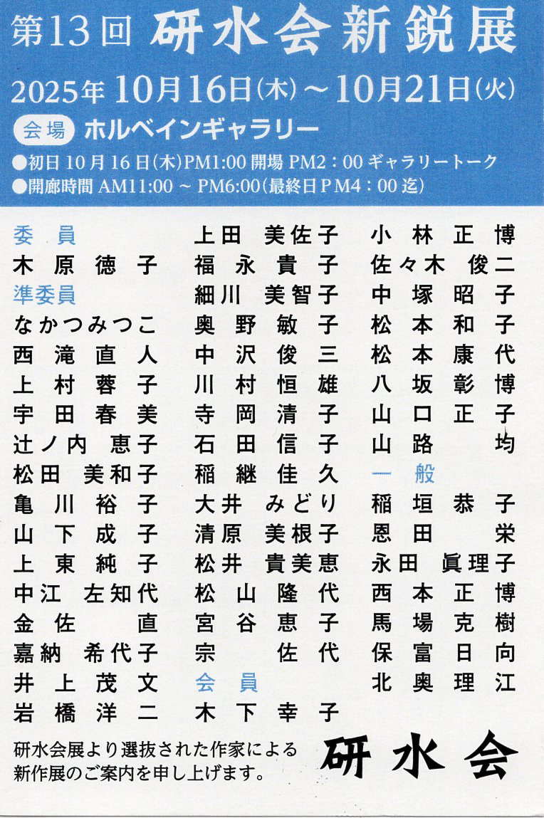第13回 研水会新鋭店(ホルベインギャラリー/大阪市中央区)10月16日(木)~21日(火) 2025年9月23日 by Owner. 第13回 研水会新鋭店 (ホルベインギャラリー/大阪市中央区) 10月16日(木)~21日(火) 小林正博さん、他 前の記事 次の記事