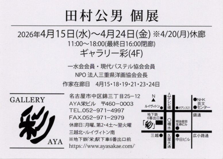 田村公男 個展(ギャラリー彩/名古屋)4月15日(水)~24日(金) 2026年3月3日 by Owner. 田村公男 個展 (ギャラリー彩/名古屋) 4月15日(水)~24日(金) 前の記事 次の記事
