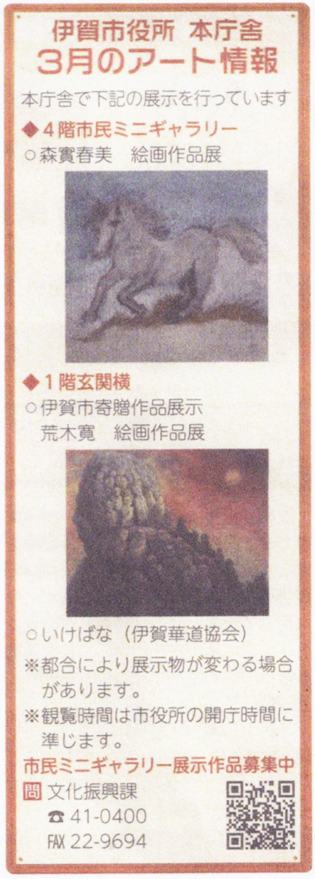 森實 春美 絵画作品展(伊賀市役所4階ミニギャラリー)3月2日(月)~31日(火)土日祝休み 2026年3月11日 by Owner. 森實 春美 絵画作品展 (伊賀市役所4階ミニギャラリー) 3月2日(月)~31日(火)土日祝休み 前の記事 次の記事