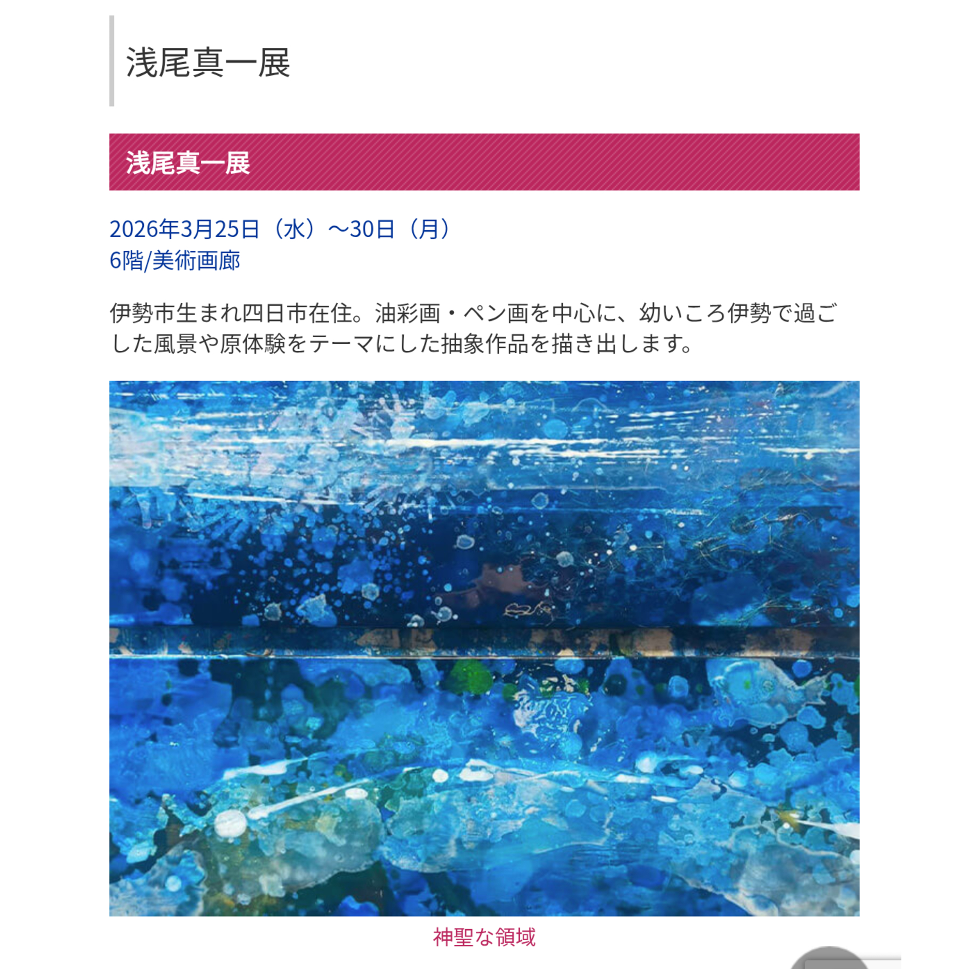 浅尾真一展 このまがくれ弐 (松菱百貨店6階 松菱美術画廊/津市) 3月25日(水)~30日(月) 2026年3月23日 by Owner. 浅尾真一展 このまがくれ弐 (松菱百貨店6階 松菱美術画廊/津市) 3月25日(水)~30日(月) 前の記事 次の記事