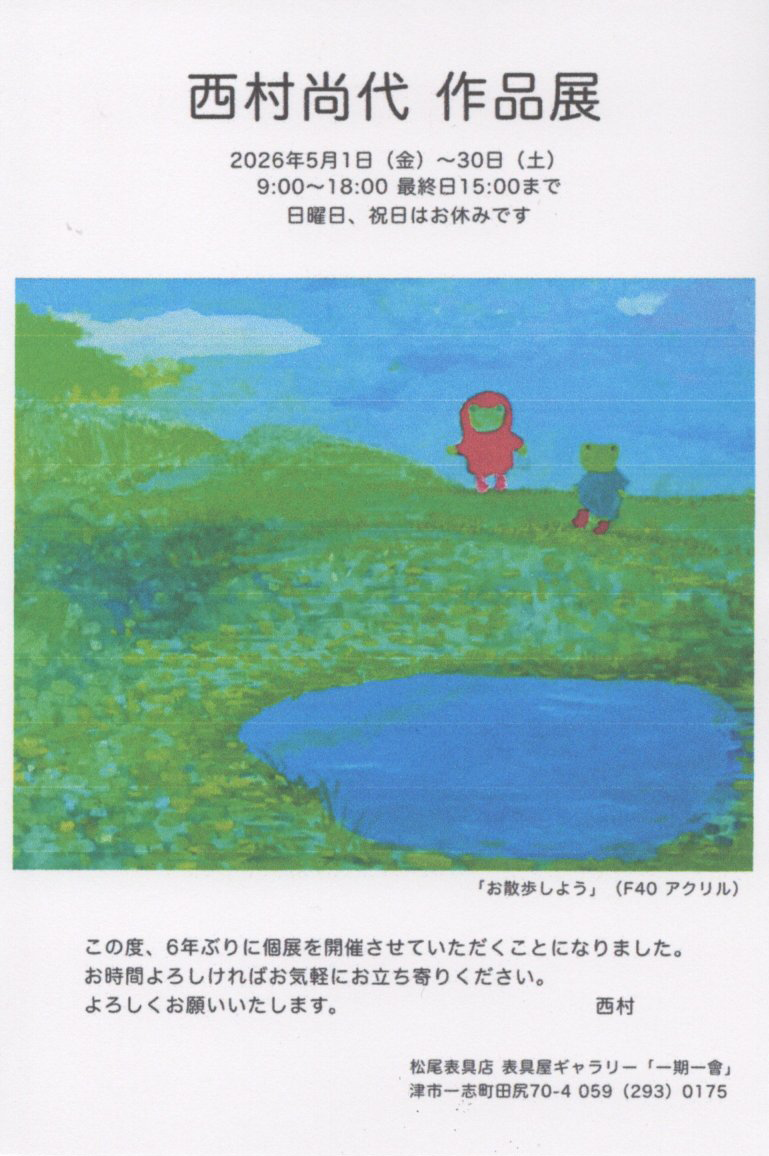 西村尚代 作品展(松尾表具店 表具屋ギャラリー「一期一會」/津市一志町)5月1日(金)~30日(土)日祝休 2026年4月15日 by Owner. 西村尚代 作品展 (松尾表具店 表具屋ギャラリー「一期一會」/津市一志町) 5月1日(金)~30日(土)日・祝休み 前の記事 次の記事
