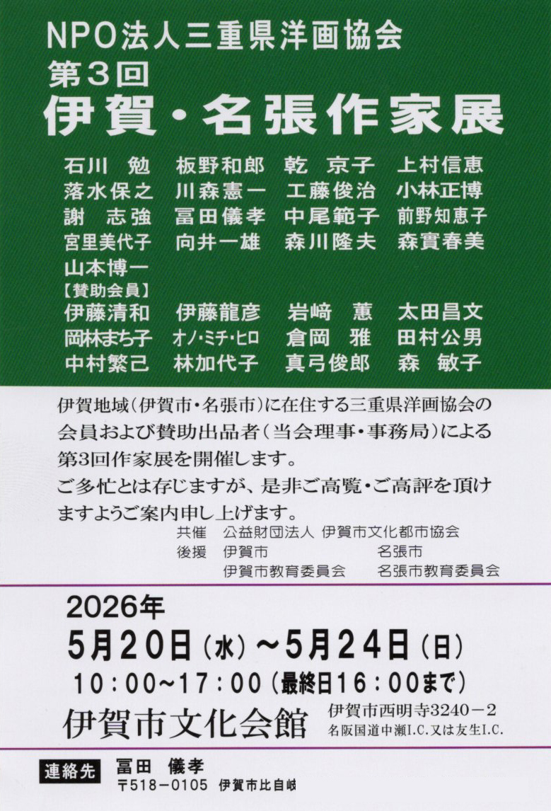三重県洋画協会 第3回伊賀・名張作家展(伊賀市文化会館/伊賀市)5月20日(水)~24日(日) 2026年4月15日 by Owner. 三重県洋画協会 第3回伊賀・名張作家展 (伊賀市文化会館/伊賀市) 5月20日(水)~24日(日) 前の記事